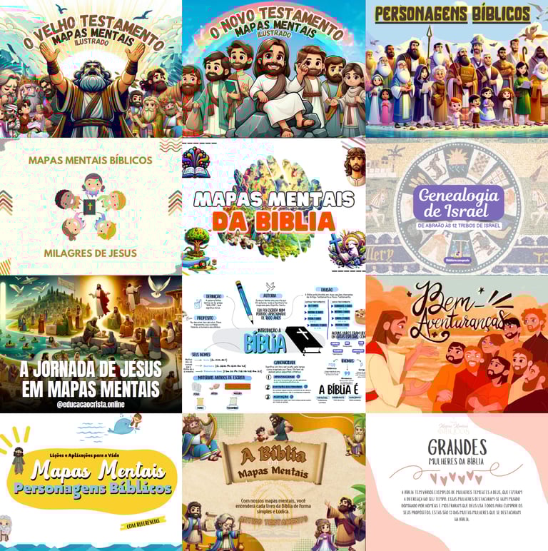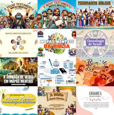 Mapas mentais são diagramas visuais que organizam ideias de forma clara e prática, facilitando o entendimento e a memorização. No Super Pack Cristão você encontrará mapas mentais sobre personagens bíblicos, doutrinas, livros, grandes mulheres da Bíblia e muito mais!